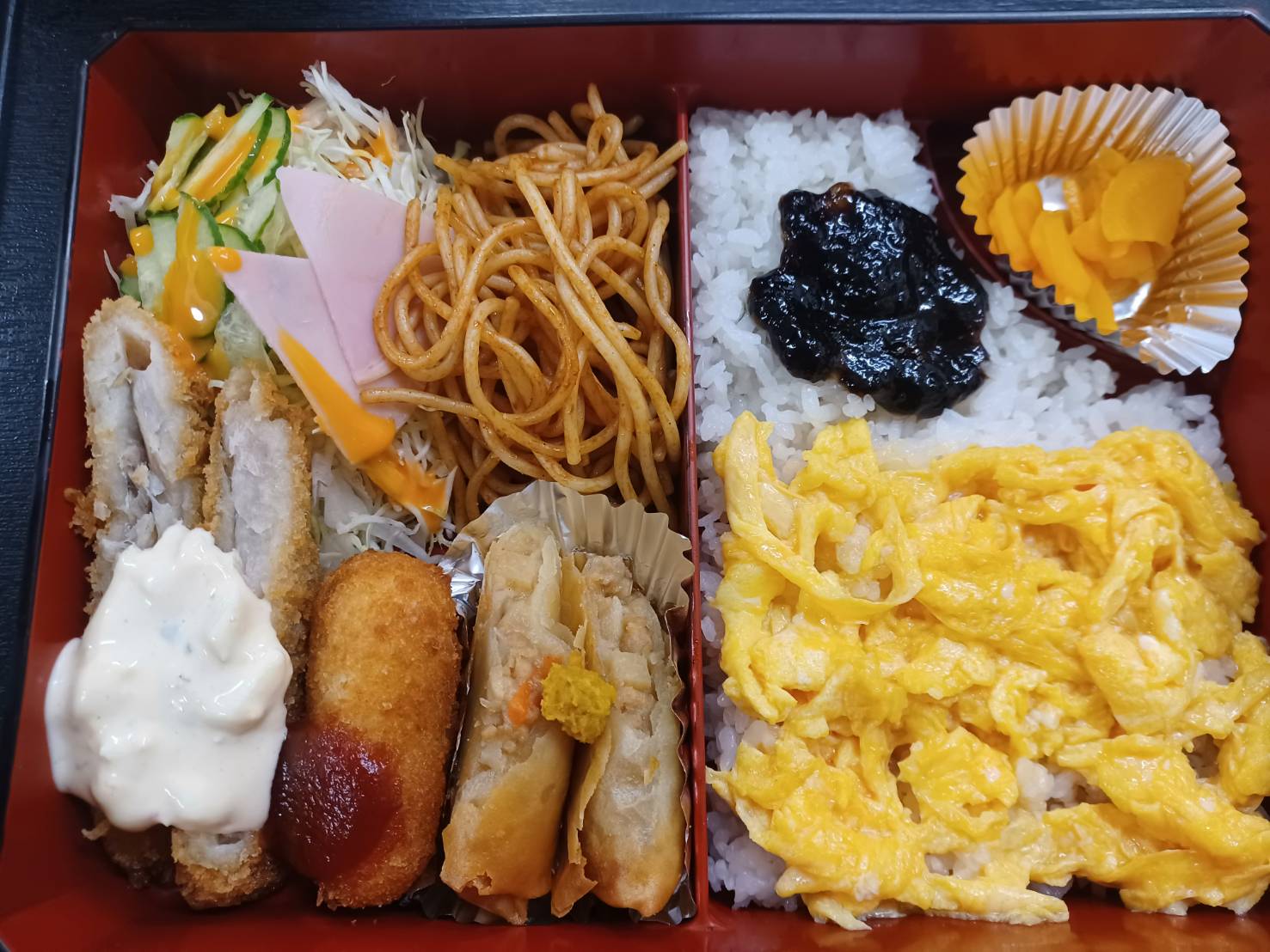 | サマーボックス お店・・・・・・・・・・¥870 出前・・・・・・・・・¥850 お持帰・・・・・・・¥890 魚フライ、エビフライ、チキンカツ サラダ, ロースハム, 漬物, みそ汁 御飯の上に「塩昆布」と 「スクランブルエッグ」 |