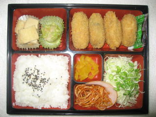 | かきフライ弁当 お店・・・・・・・・・・¥970 出前・・・・・・・・・・¥950 お持帰・・・・・・・・¥990 カキフライ、一品二種 サラダ、ロースハム 御飯、漬物、みそ汁 *ご指定の無い場合、カキフライは タルタルソースとさせていただきます。 |