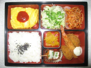 | 「食欲弁当」 お店・・・・・・・・・・¥970 出前・・・・・・・・・・¥950 お持帰・・・・・・・・¥990 牛肉のオムレツ エビフライ、ミンチカツ サラダ、ロースハム、一品、 御飯、漬物、みそ汁 |